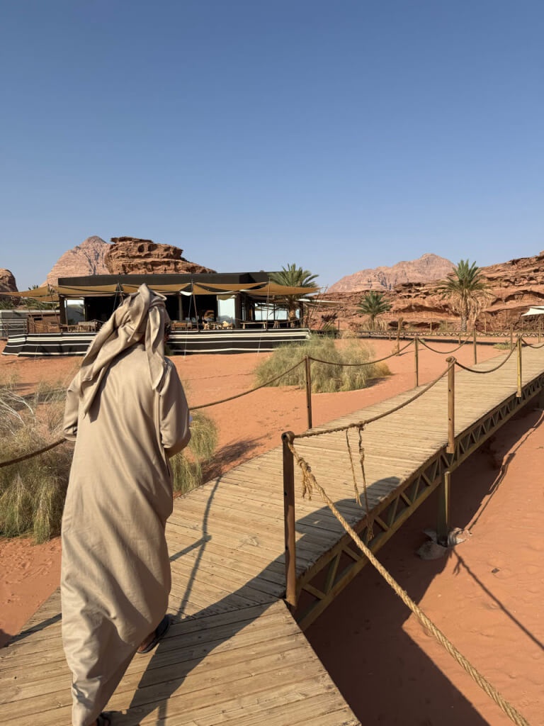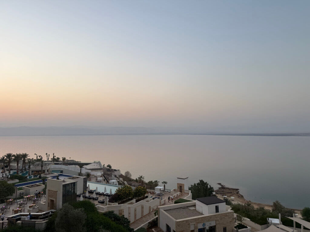 Ook hier hebben ze vanwege klimaatverandering een uitdaging. Het meer wordt ieder jaar kleiner. Ter illustratie, toen dit hotel 12 jaar geleden werd gebouwd lag het aan het water. Nu zijn er twee liften gerealiseerd om zo’n 20 meter af te dalen en het water te bereiken. Er wordt al jaren gesproken over een systeem dat water van de Rode naar de Dode Zee pompt, maar dat wordt door Covid en de oorlog in Gaza steeds uitgesteld.